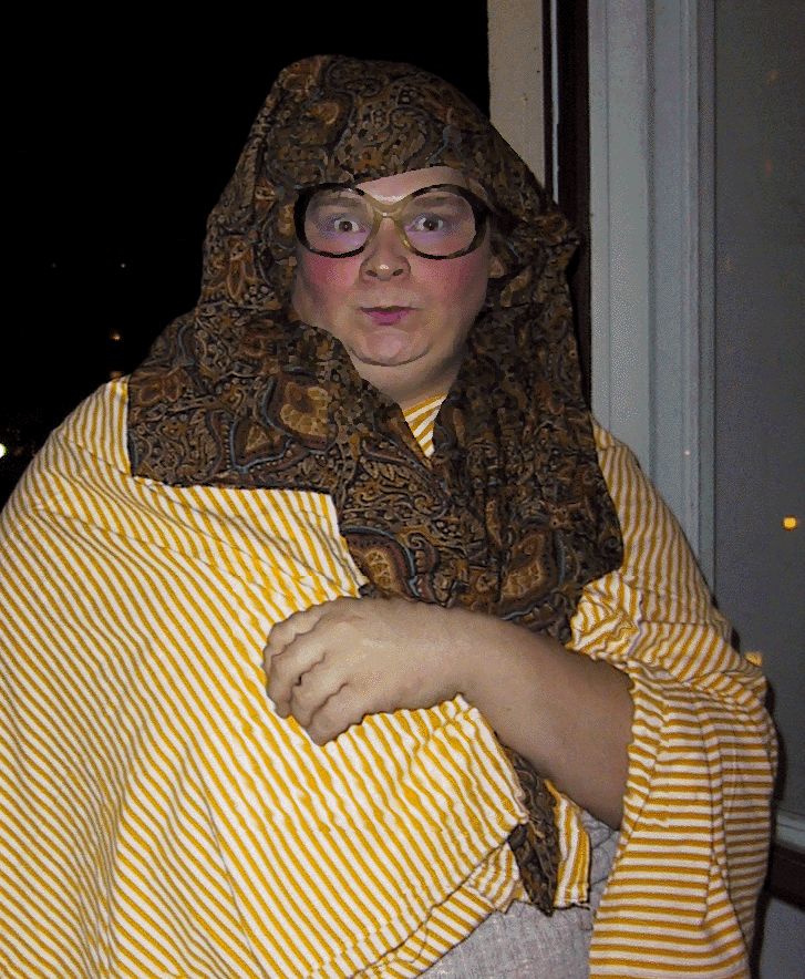 päähän ja vanha lakana toimivat, helppo tapa pukeutua.